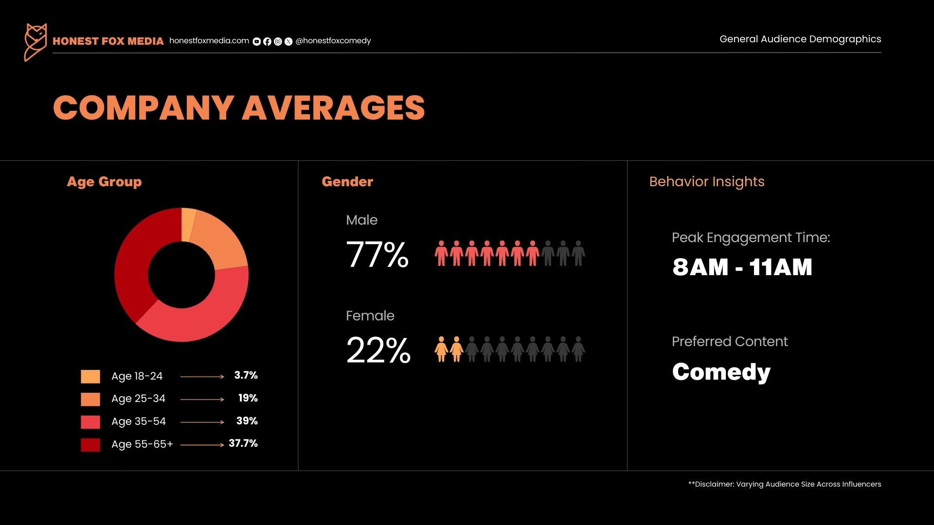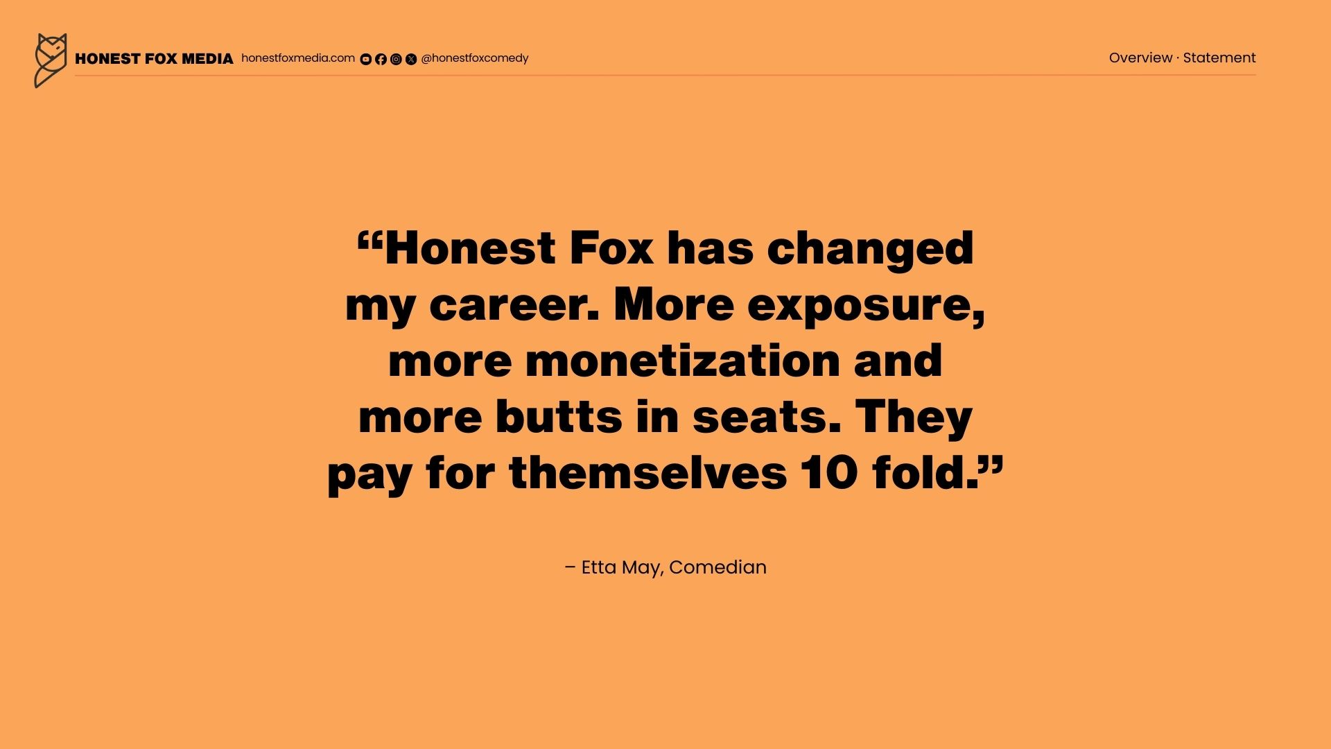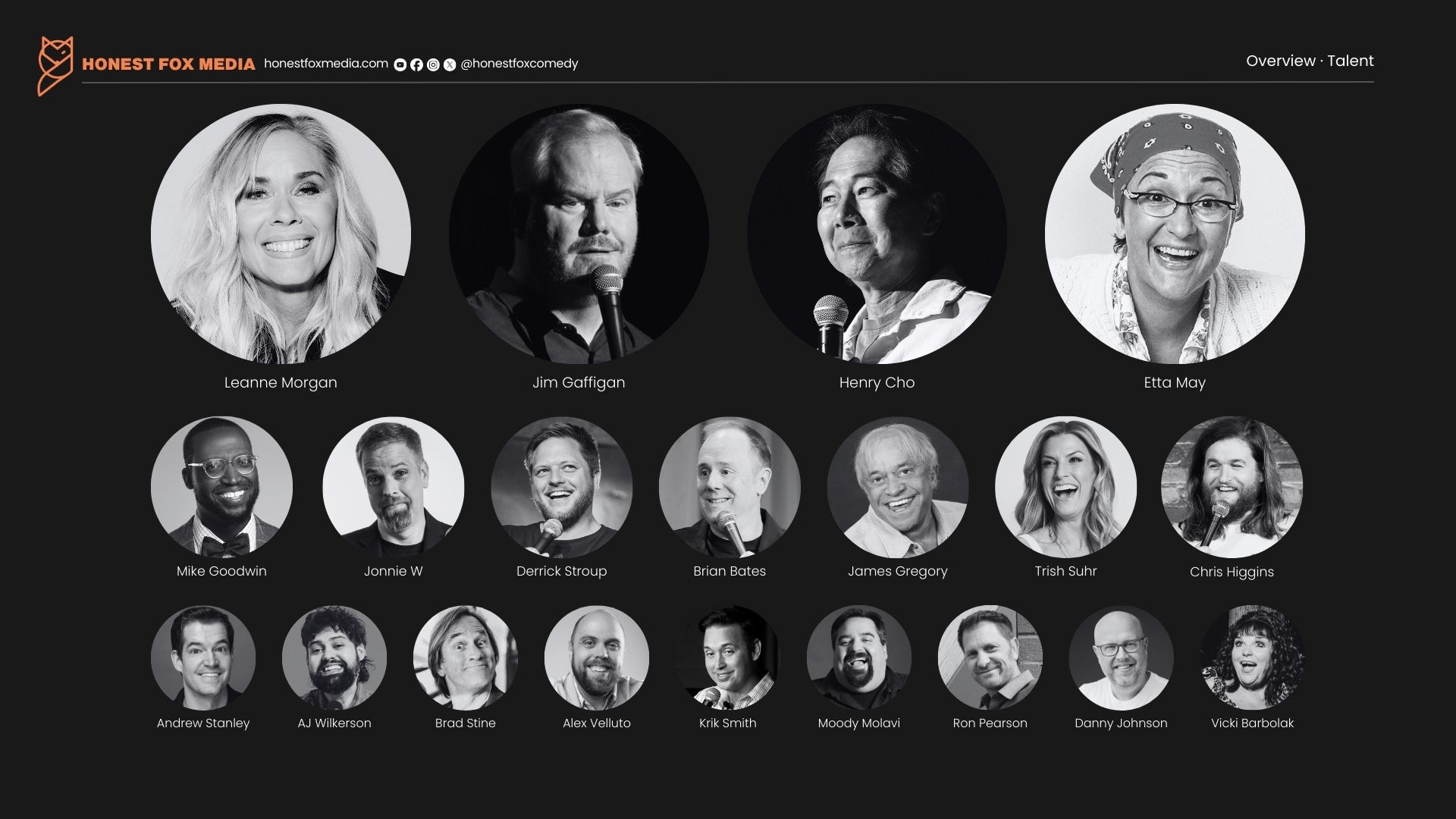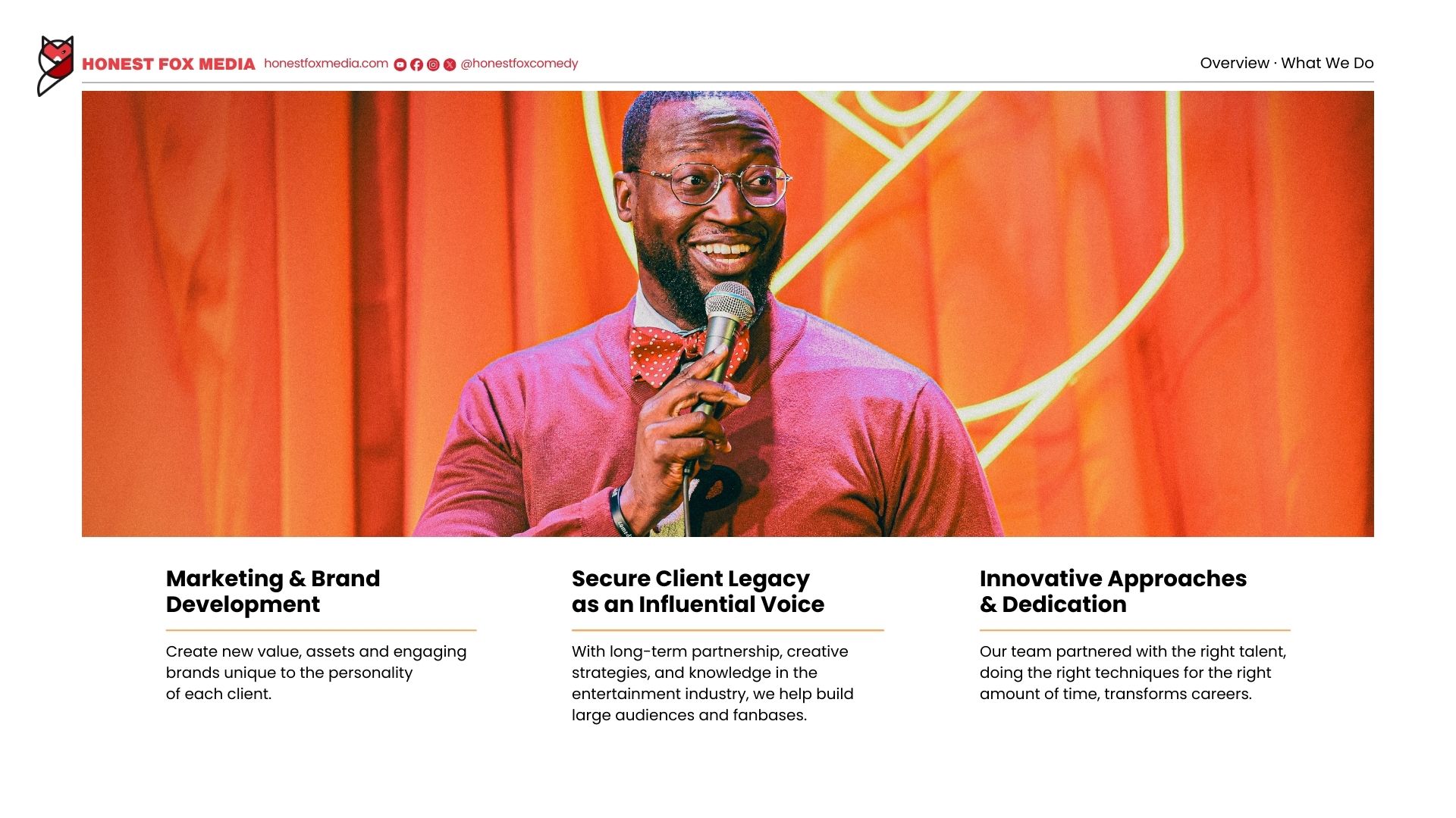 At Honest Fox Media, our mission is to be the catalyst for comedic brilliance. We are dedicated to identifying, nurturing, and propelling comedic talent to new heights, fostering a dynamic environment where creativity thrives, and laughter resonates. With integrity at our core, we empower individuals to reach their full comedic potential, entertaining audiences and leaving an enduring mark on the world of humor.